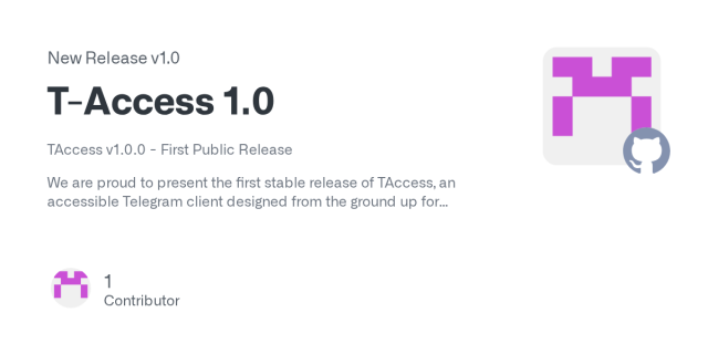 TAccess v1.0.0 - First Public Release We are proud to present the first stable release of TAccess, an accessible Telegram client designed from the ground up for efficiency and ease of use with scre...GitHub