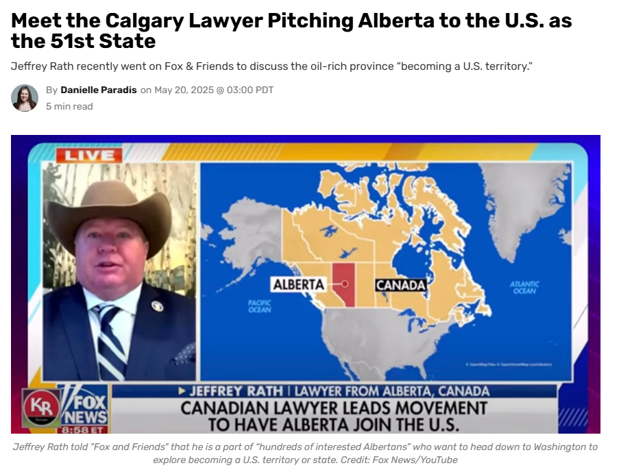 I'm not sure why Alberta Wexiteers wanting to join the US is suddenly a big story about treason 11 months after Jeffrey Rath went on Fox&Friends to announce it and DeSmog wrote about it.