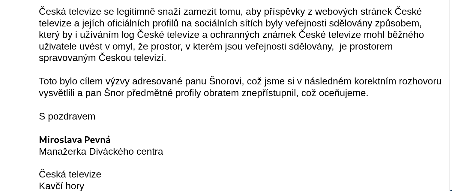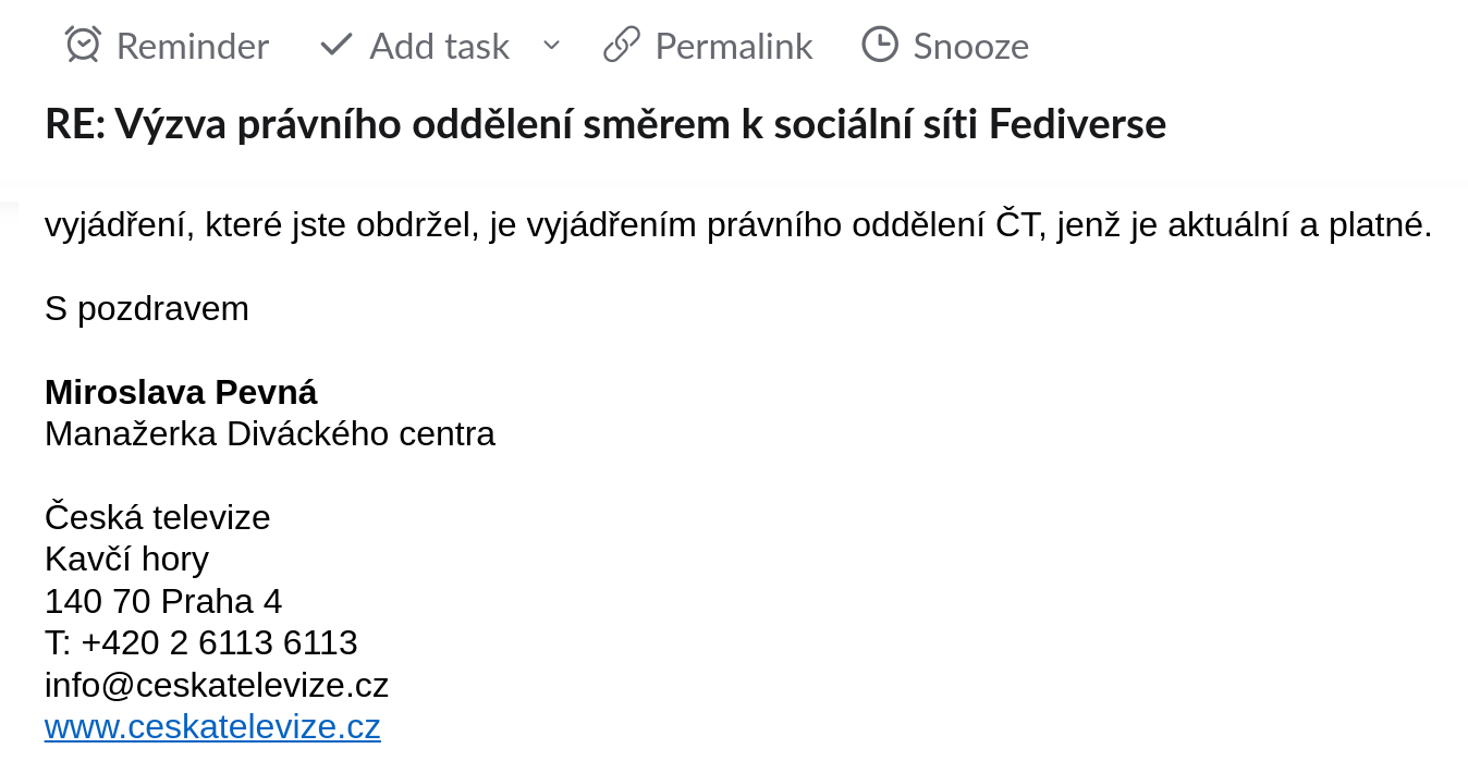 Dopis adresovaný panu Šnorovi v podstatě říká, že i jako uživatel sociální sítě nemohu odkazovat na Vaše články, protože nemám výslovný souhlas ČT, což je naprosto absurdní a v podstatě v rozporu s účelem veřejnoprávního média vytvářejícího zpravodajství z povinných koncesionářských poplatků o jejichž navýšení televize usiluje. Chci tímto tedy požádat ČT o vyřešení situace tak, aby věc byla právně v pořádku - ať už se bude jednat o udělení výslovného oprávnění k sdílení příspěvků v rámci sociální sítě Fediverse (které si ale přes to všechno nemyslím, že je potřeba) anebo otevření Vašich vlastních účtů.
