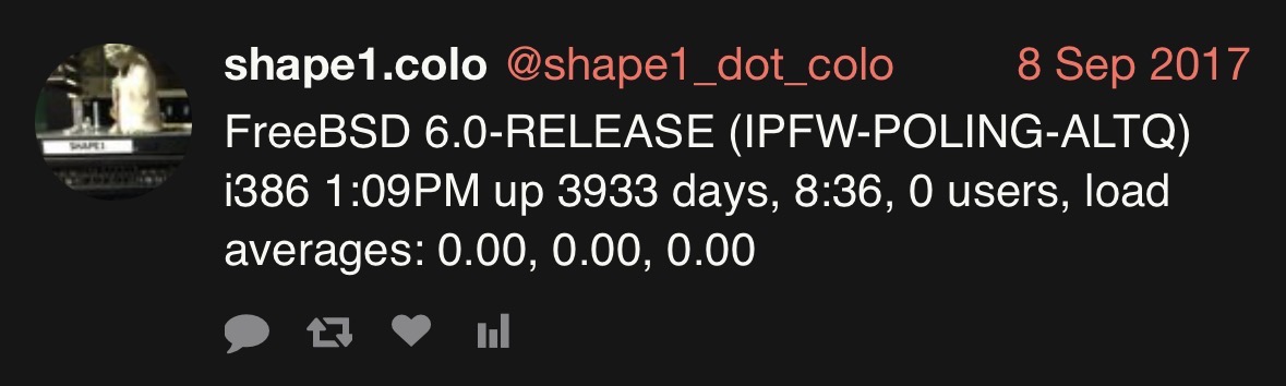 That server had absolutely zero open ports to the internet and only acted as a transparent network traffic shaper with IPFW/ALTQ. It provided 10 years of service providing rock solid performance in this environment. I don't recall there being any CVEs that affected IPFW/ALTQ or any other TCP/IP functionality that it exposed.