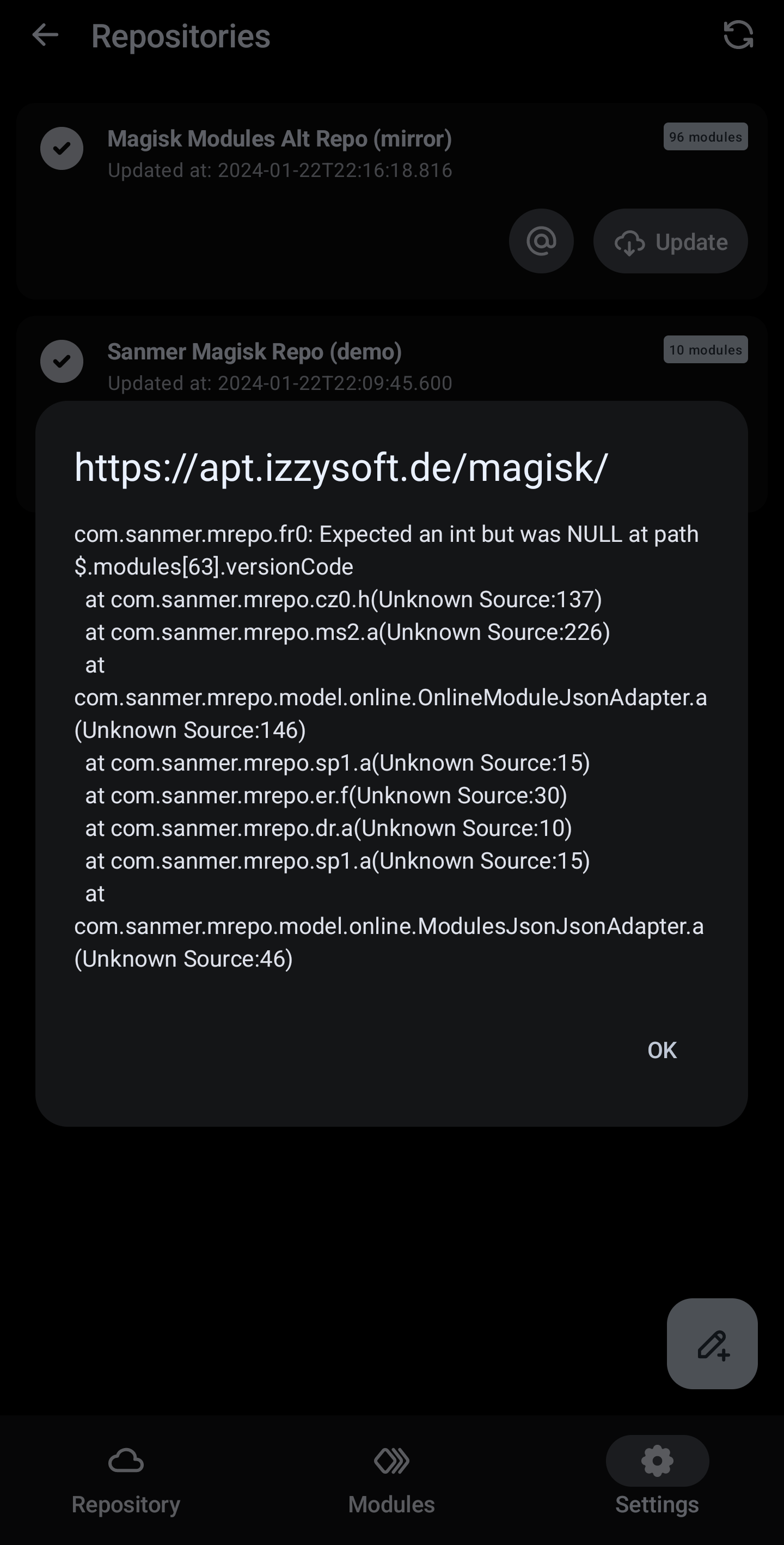 My MRepo here says it was last updated 2024-01-07 (hm, so it doesn't seem to update by itself then? Ah, trying to manually update crashes with some error saying a versionCode was NULL. But it doesn't say on what module, and repo-util didn't complain here…