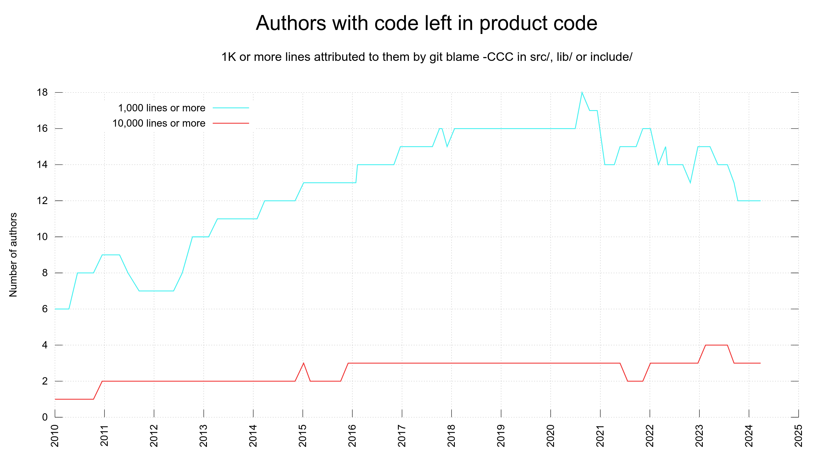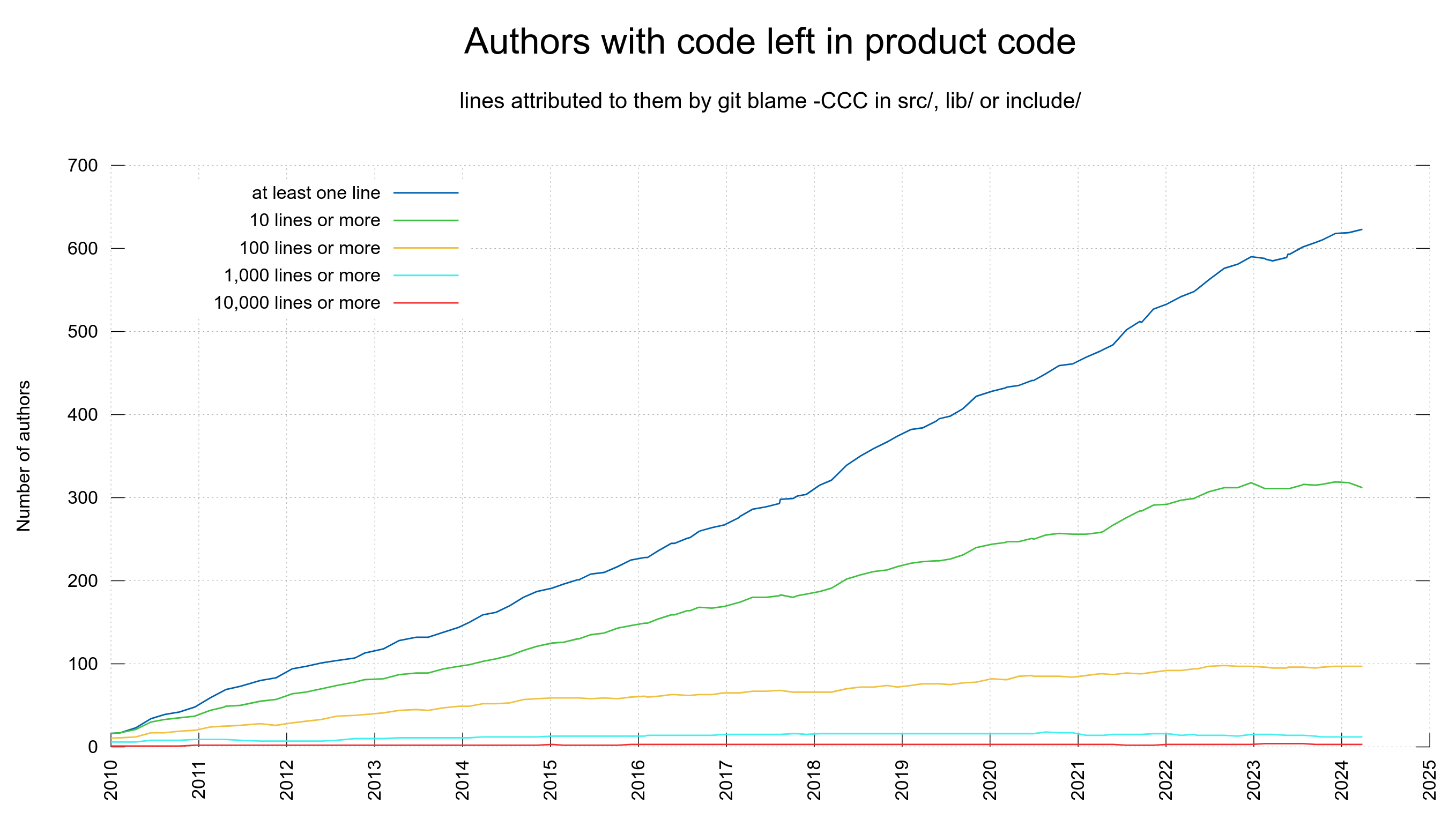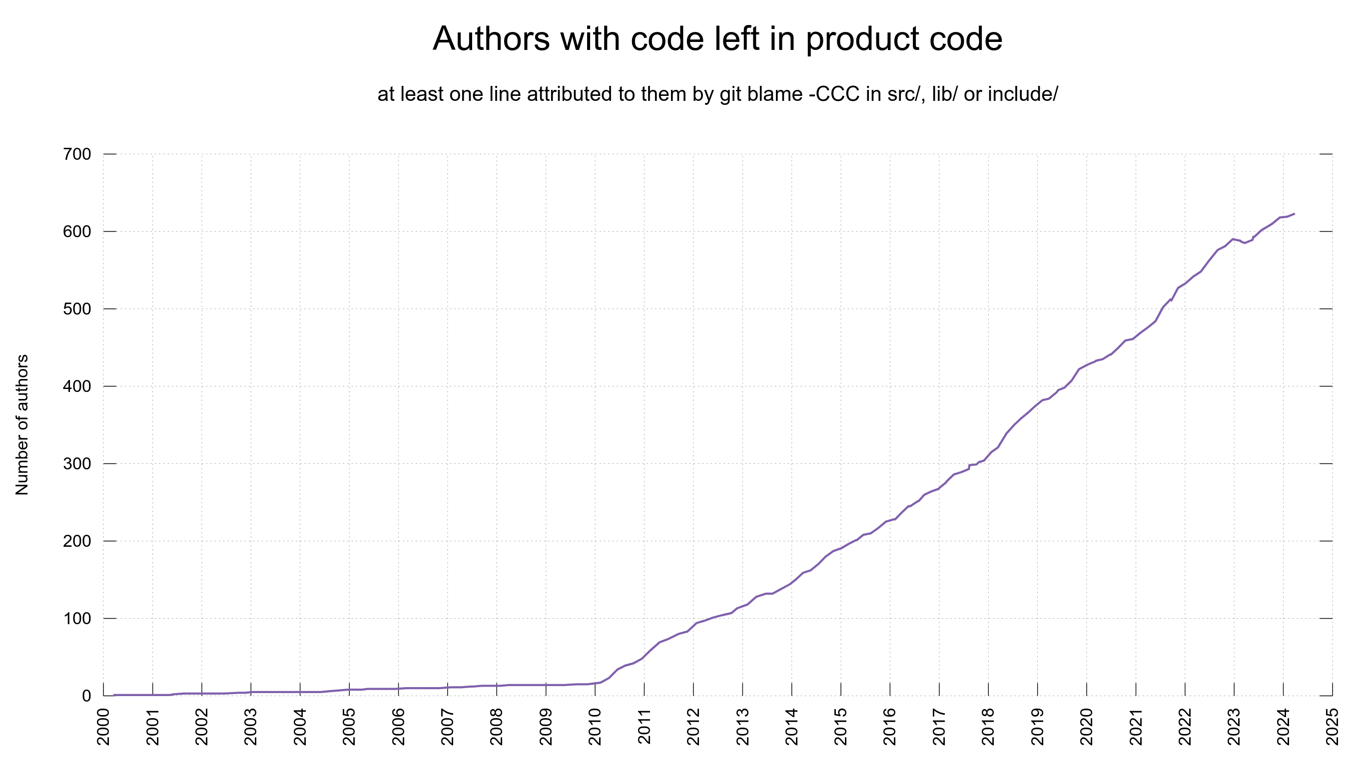 Of course, any metric isn't going to be perfect, doing it via `git blame` is probably the best you can reasonably do, but worth keeping in mind even that users who don't show up that way may still be authors.