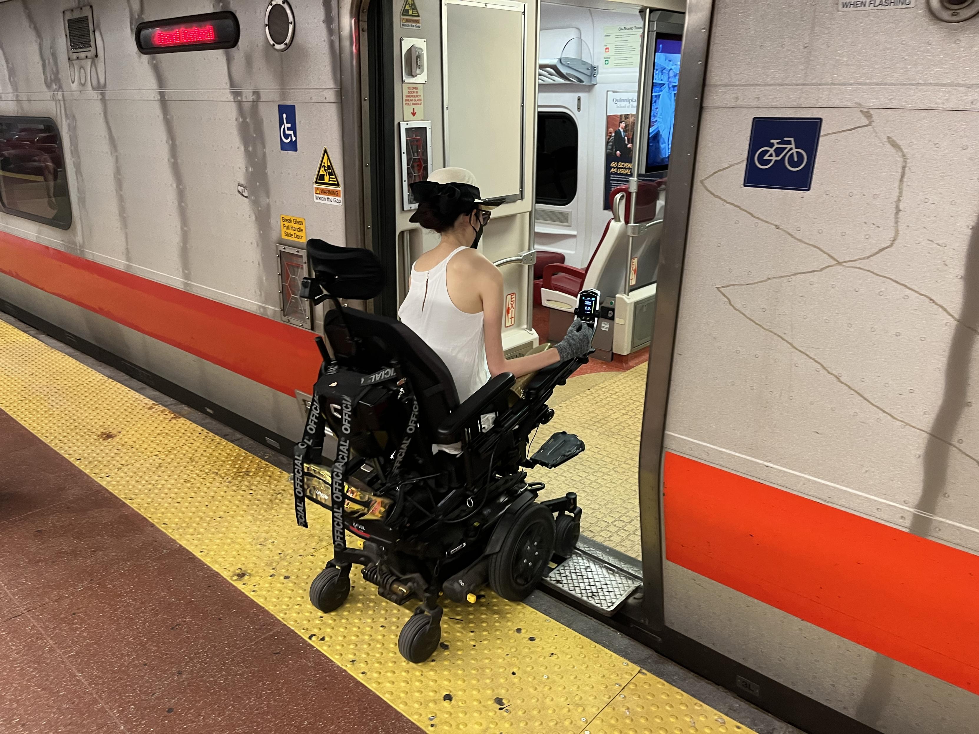 We’re now on a Metro North train for the first time. Buying tickets and finding the platform at Grand Central was pretty easy. The level boarding was also pretty good, with a minimal horizontal and vertical gap between train and platform. Also, no elevators all the way from the street to the train, which is awesome. Unfortunately, no windows in the wheelchair areas of the train, which is tragically common on trains.