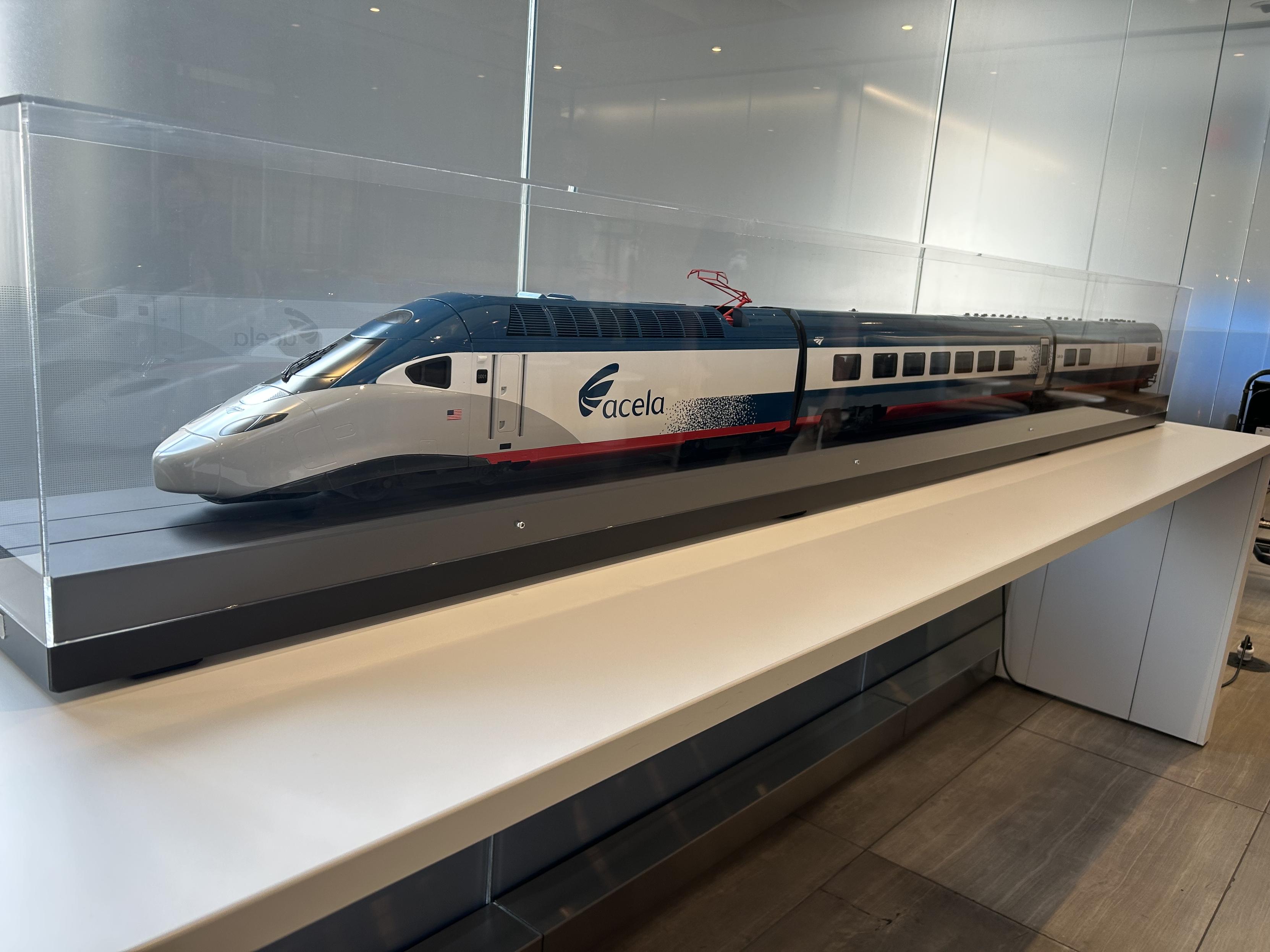 in reply to Peter Saathoff-Harshfield • • •Photos: Moynihan Train Hall, a model of new Acela trains, Aubrie boarding the train, and a view across the Hudson River.
