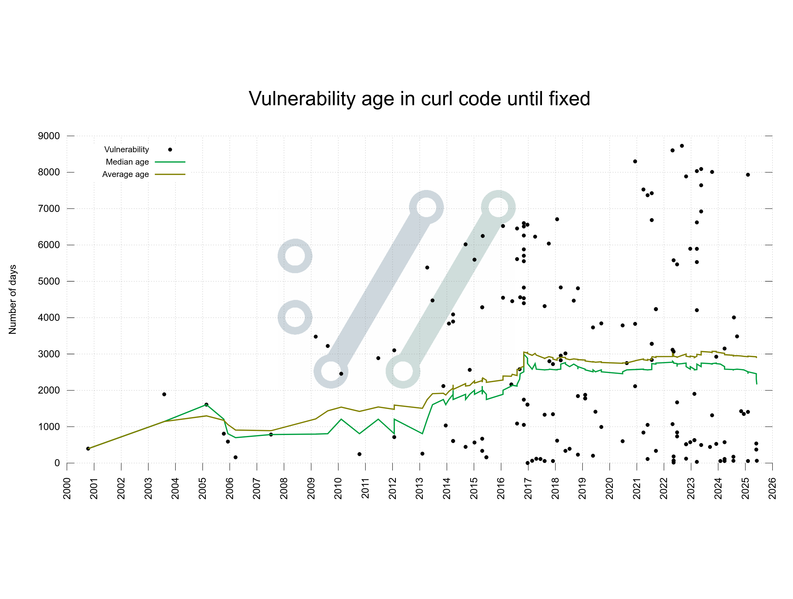 in reply to daniel:// stenberg:// • • •I would expect a trend that is somewhat "real" up to (current time - mean age of vuln * 1.5) or so.