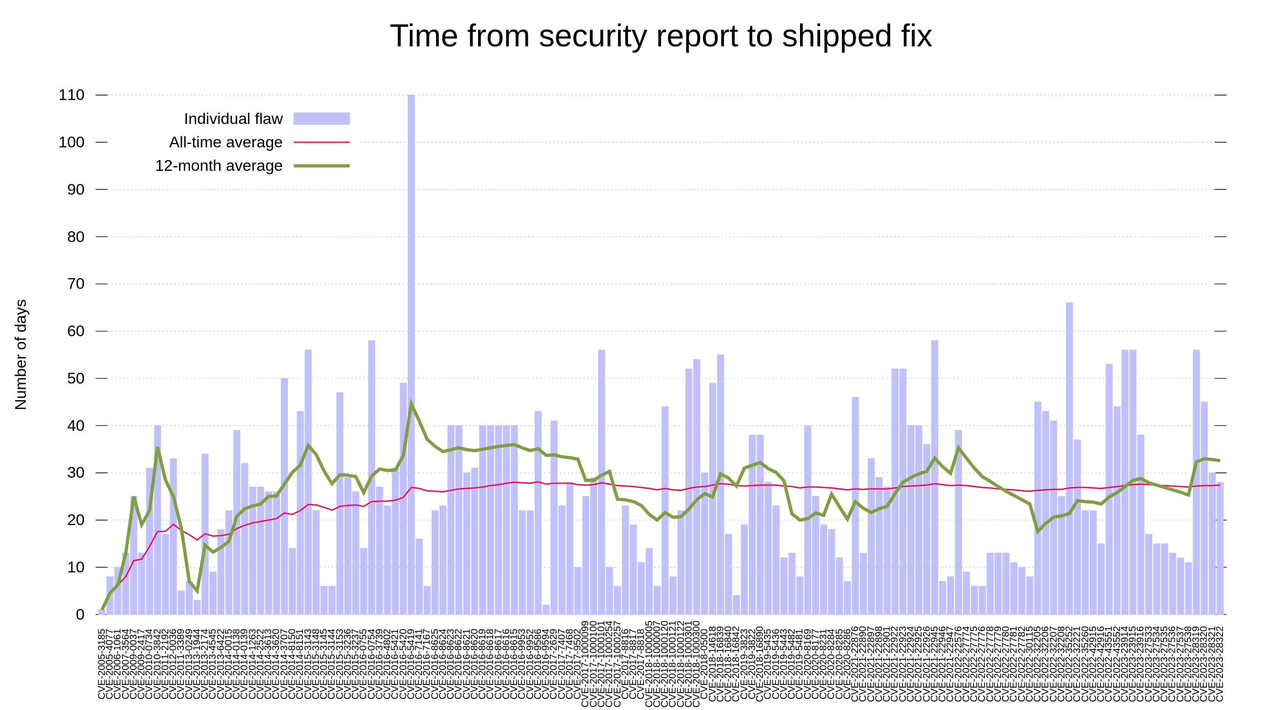 The graph shows all 145 curl CVEs and the number of days each of them existing in shipped source code until fixed.