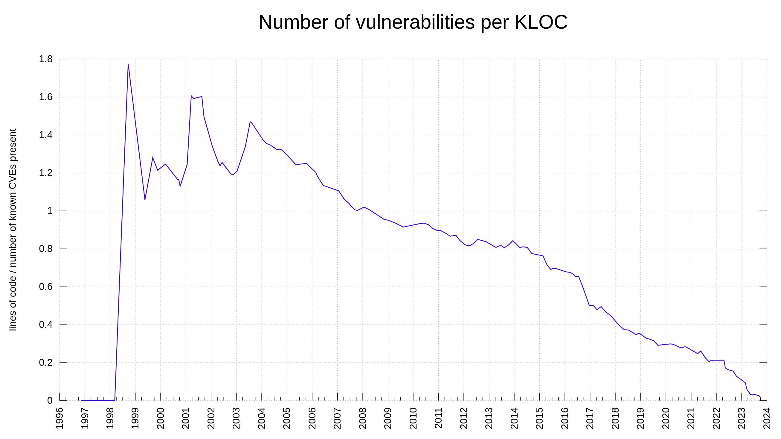 @hyc Not bad: The number of vulns per kloc at 1.77 in 1998 and crawls down to 0.112 in late 2022. Still linear yaxis.