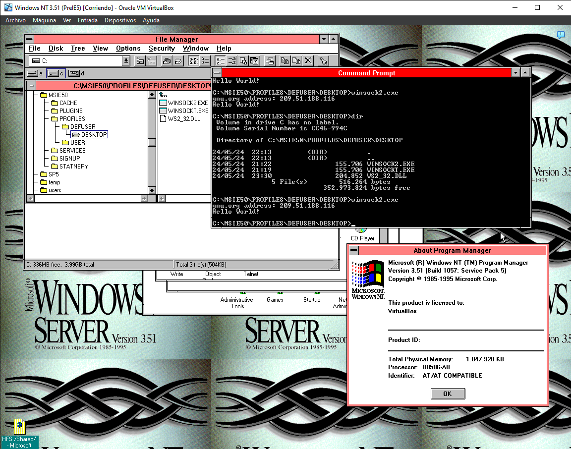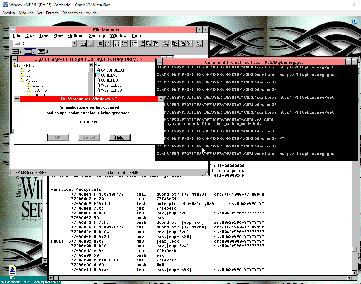 in reply to Daniel • • •It works! After various modifications on Winsock2 and curl itself, #curl 8.4.0 can run on Windows NT 3.51!