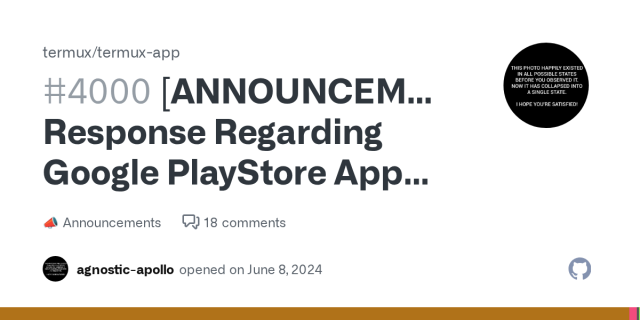 [ANNOUNCEMENT] Response Regarding Google PlayStore App Updates · termux termux-app · Discussion #4000
