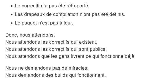 et j'ai même pas commencé à parler des APIs manquantes, de l'accessibilité de chaque logiciel de la suite de bureau aux navigateurs, baladeurs média, processeurs de texte etc., etc., etc.