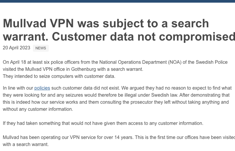 Mullvad has been operating our VPN service for over 14 years. This is the first time our offices have been visited with a search warrant."