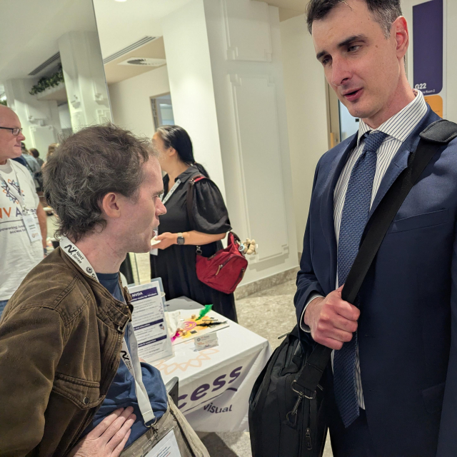 Pictured is NV Access founder Michael Curran chatting with Michael Sheppard after the presentation about how he uses NVDA.