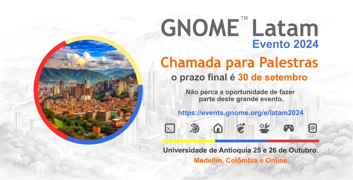 Você tem algo para compartilhar sobre o ecossistema #GNOME ou software livre? Esta é sua oportunidade! Envie sua proposta e junte-se a nós em Medellín, Colômbia, ou online.