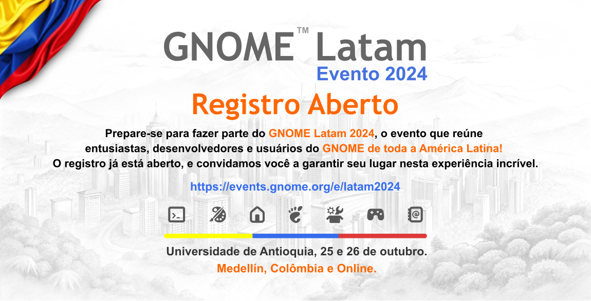 Não perca a oportunidade de fazer parte deste evento que une a comunidade #GNOME na América Latina! Inscreva-se agora e garanta seu lugar em Medellín, Colômbia, ou online.