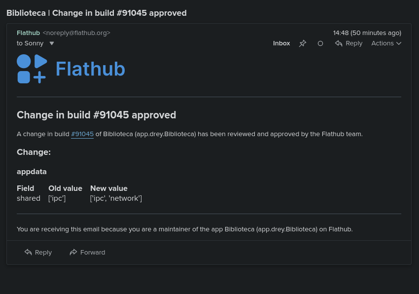 Received my first automated email from Flathub to inform me that the permission change in our app "Biblioteca" is under review.