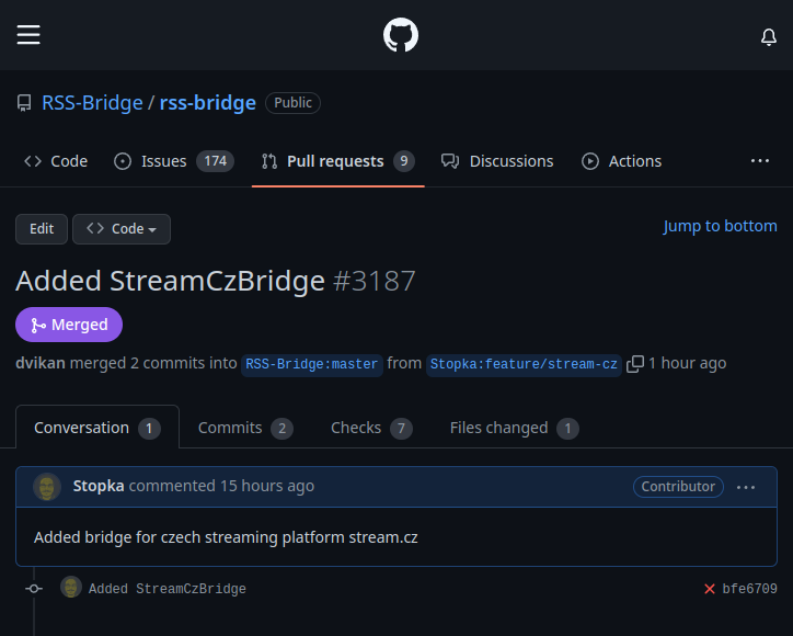 2️⃣ In the evening I created a pull request to #RSSBridge adding stream.cz support.