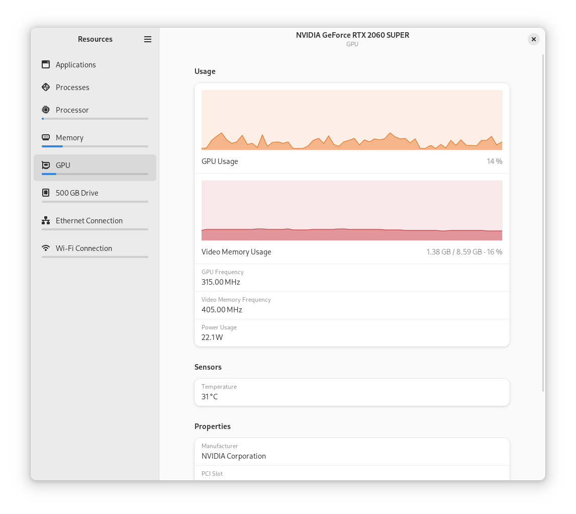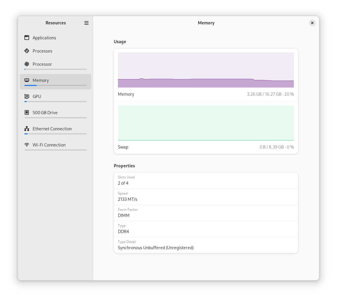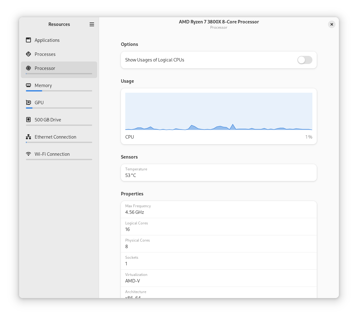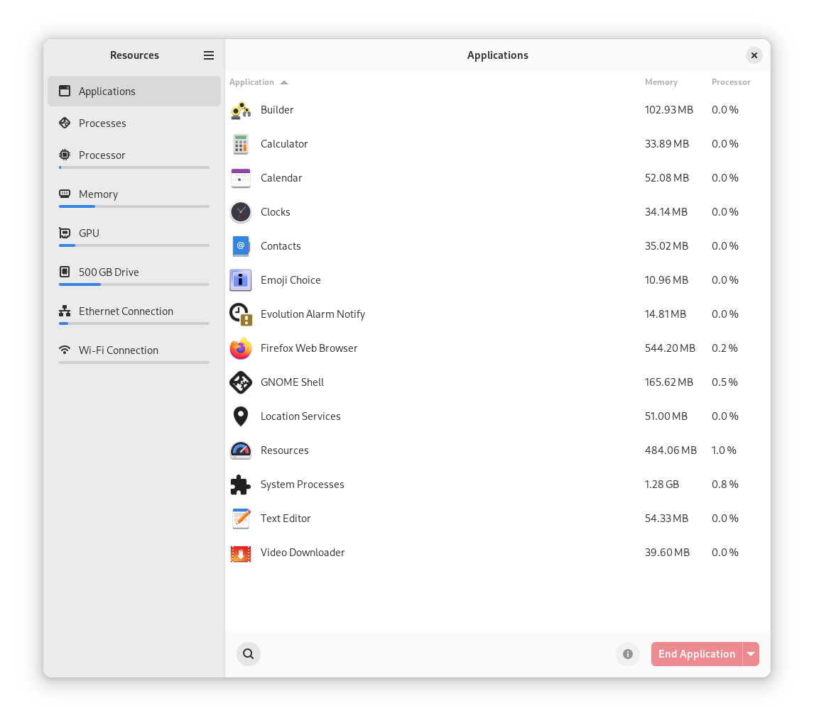 Resources is a modern interface for managing your system's processes and your open applications. See what programs you have running, and kill the apps that are wasting resources. If you want to see if that helped, you can view the usage graphs for your processor, memory, GPU and more. With Resources, keeping your system in check has never been easier!
