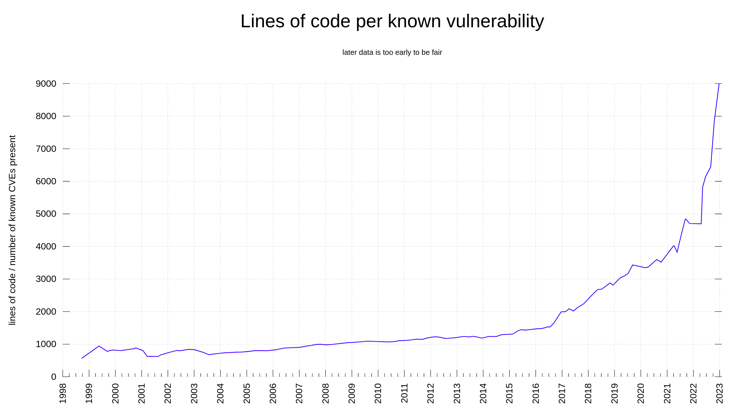 lines of code per known vulnerability in #curl, 1998 - 2023. I purposely leave out the last year simply because it is a little too new code there to be fair - and that makes the graph really spike.