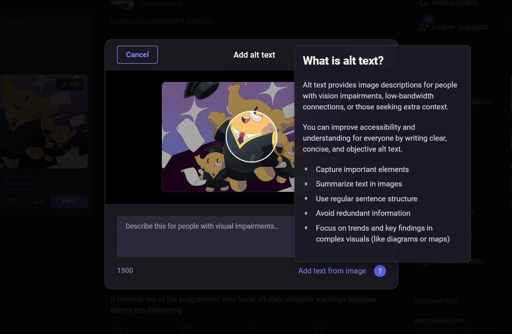 Oh nice, Mastodon is getting an alt text reminder.