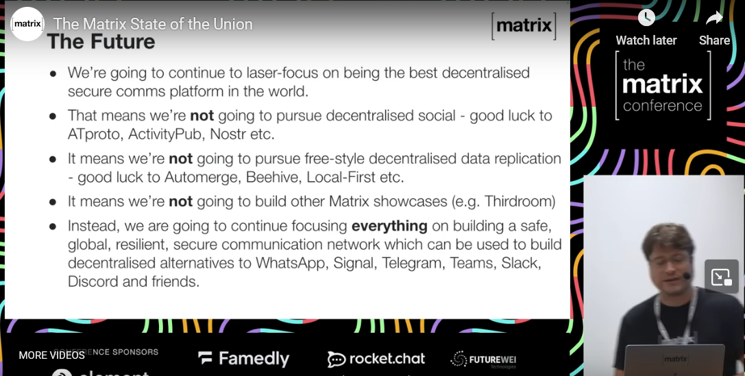 icymi, in the Matrix State of the Union they said they didn't plan on pursuing decentralized social media, but they do hope to make it easier for those ecosystems to use Matrix so they don't have to reinvent what Matrix has already done