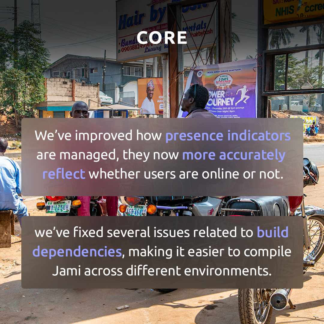 Welcome to this new Jami development update! Over the past few weeks, we've focused on stability, maintenance, and some key feature improvements across both the core and platform-specific components. Let’s dive into what’s new.jami (Jami)