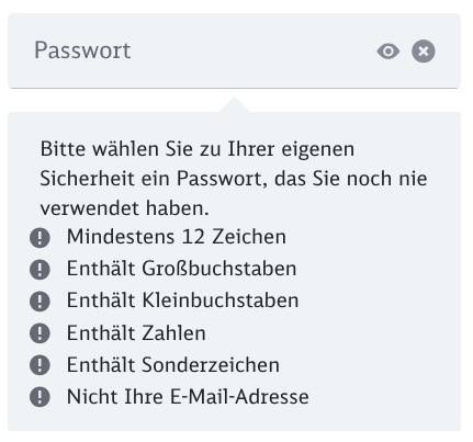 Deutsche Bahn zwingt mich, mein Login-Passwort zu ändern: Es hat 24 Zeichen, ist zufällig, beinhaltet Groß-/Kleinbuchstaben und Zahlen und hat eine Entropie über 110 Bit. Aber weil kein Sonderzeichen drin ist, gilt es als unsicher. Sicherheitsrichtlinien von 2005 lassen grüßen. 🙄