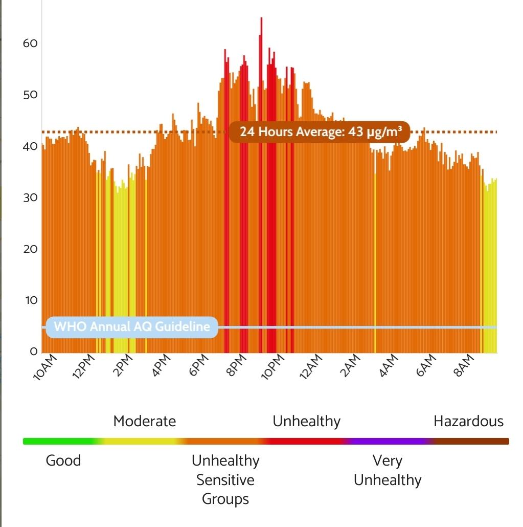 Last 24 hours from our #AirQuality monitor. This is a typical day when you can already smell it. We live in a residential area on the outskirts of #Brno and in winter the air quality tends to be (sometimes much) worse than in the city center. All because of local heating systems that use wood and, to a lesser extent, coal.