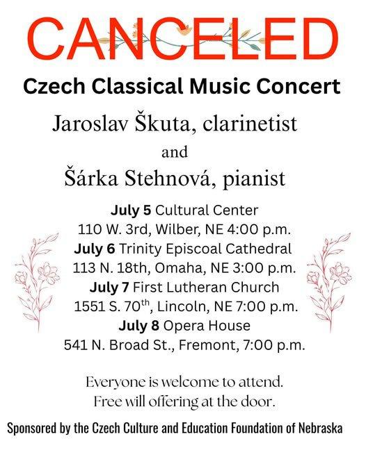 "Jaroslav Skuta, a clarinetist from the Czech Republic, was scheduled to play four concerts - Saturday in Wilber, Sunday in Omaha, Monday in Lincoln and Tuesday in Fremont.