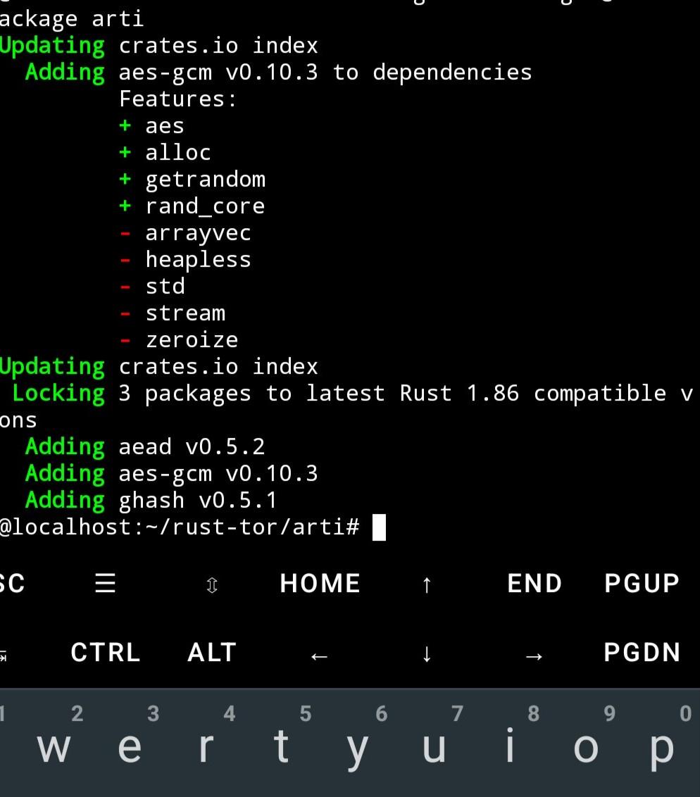 su - user because Arti will complain eventhough phone is not really rooted, change etc/resolv.conf to cloudflare, add dependencies needed for #rust rustup and cargo on #debian #trixie, chmod g-w ~/.config