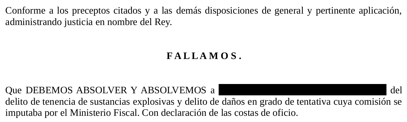 La Audiencia Provincial de Burgos ha absuelto a una persona acusada de tenencia de explosivos y daños mediante incendio en grado de tentativa por unos hechos que se remontarían a la #HuelgaGeneral de #29M2012