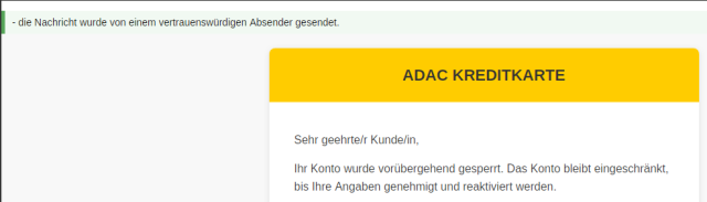 Im Footer dann auch der übliche Hinweis: "Bitte beachten Sie: ADAC wird Sie niemals per E-Mail nach sensiblen Daten fragen." Da diese Mail allerdings genau das tut… Ihr wisst Bescheid, ja? 😉